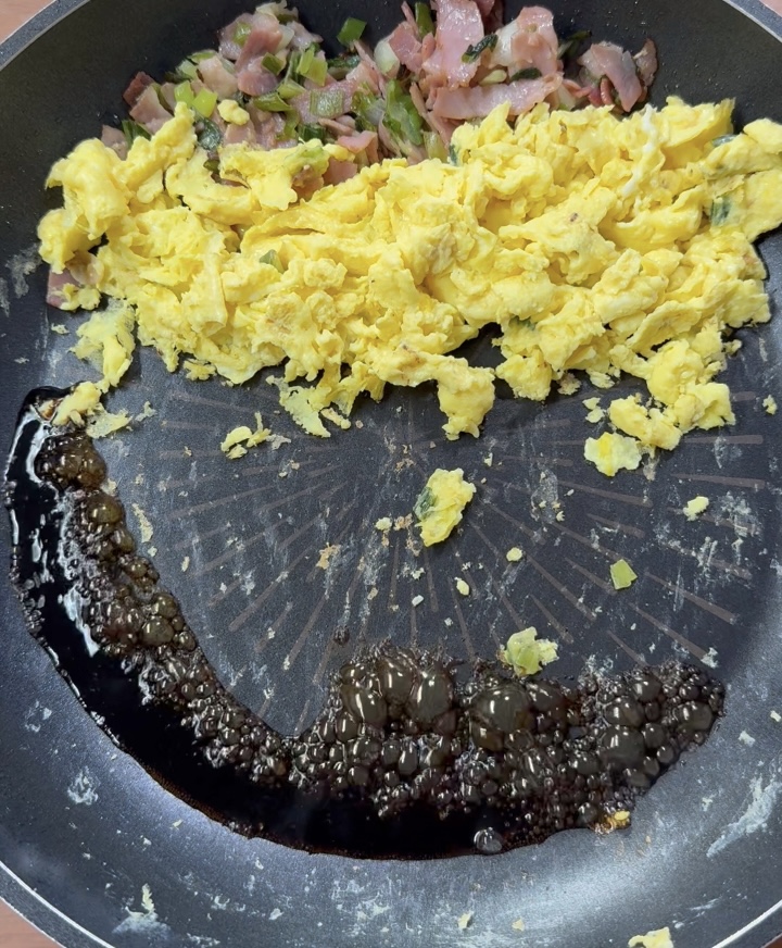 볶아놓은 재료를 팬 한쪽에 밀어두고, 풀어둔 계란을 넣어 스크램블을 만들어 섞어요