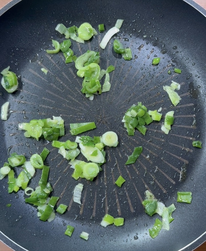 팬을 예열하고, 올리브오일 2큰술 두르고 대파를 볶아서 파기름 내주세요.