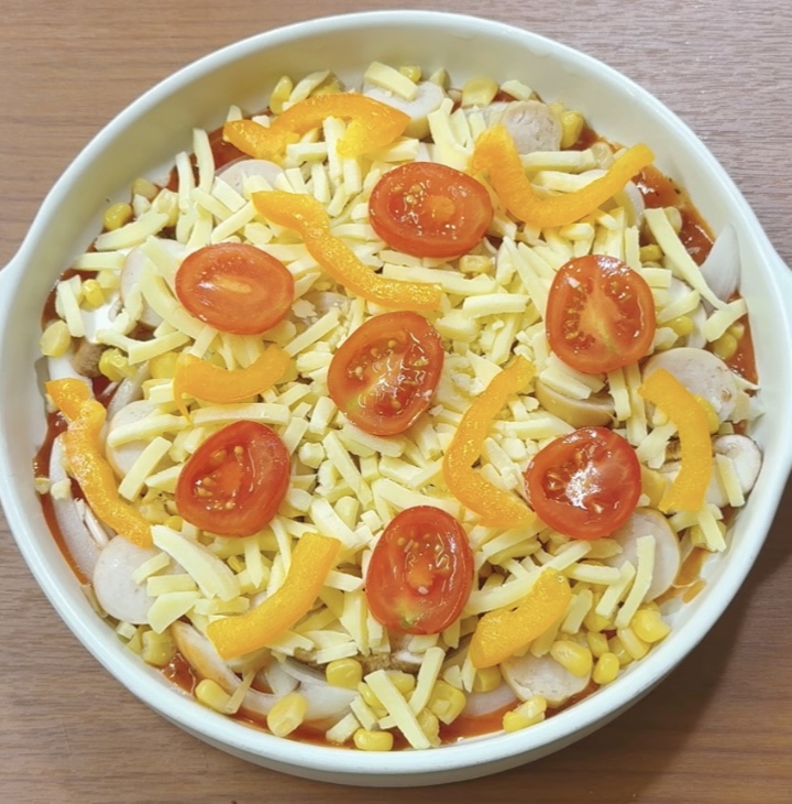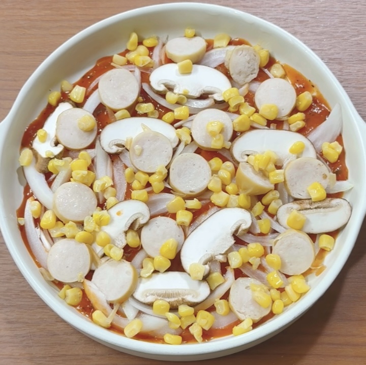 준비한 양파, 소시지, 스위트콘, 버섯을 고루 올려요.