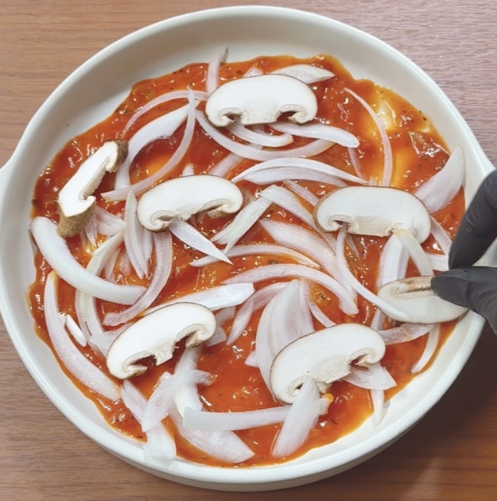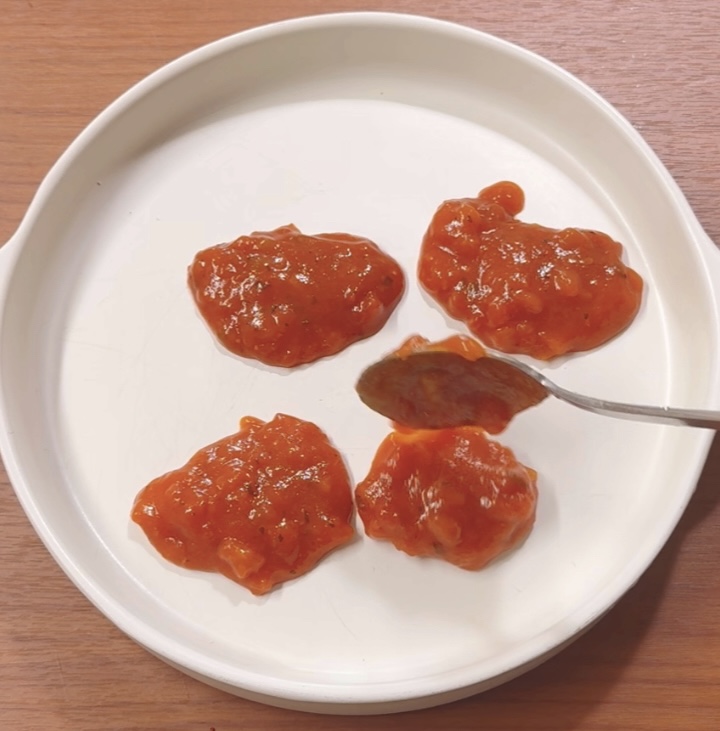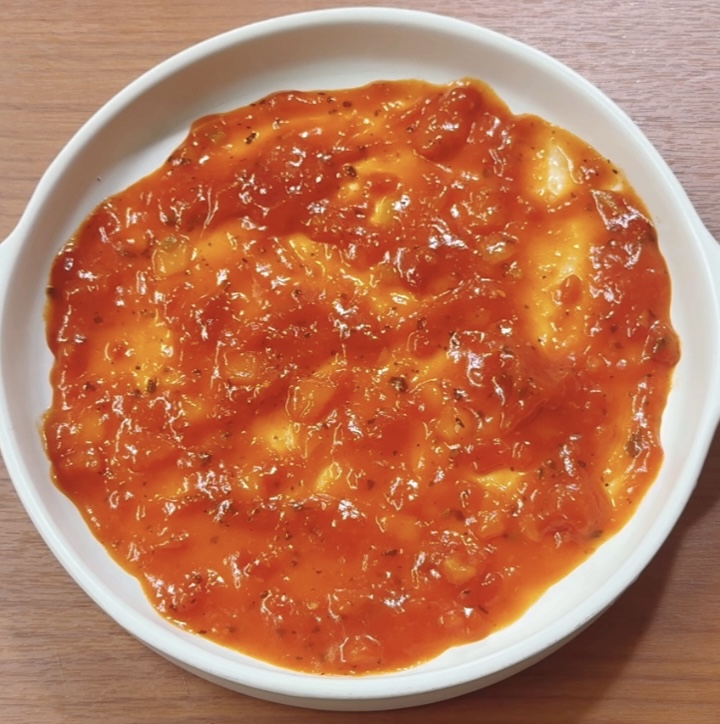 내열 용기(그라탕용 추천)에 토마토소스를 골고루 펴 발라요.