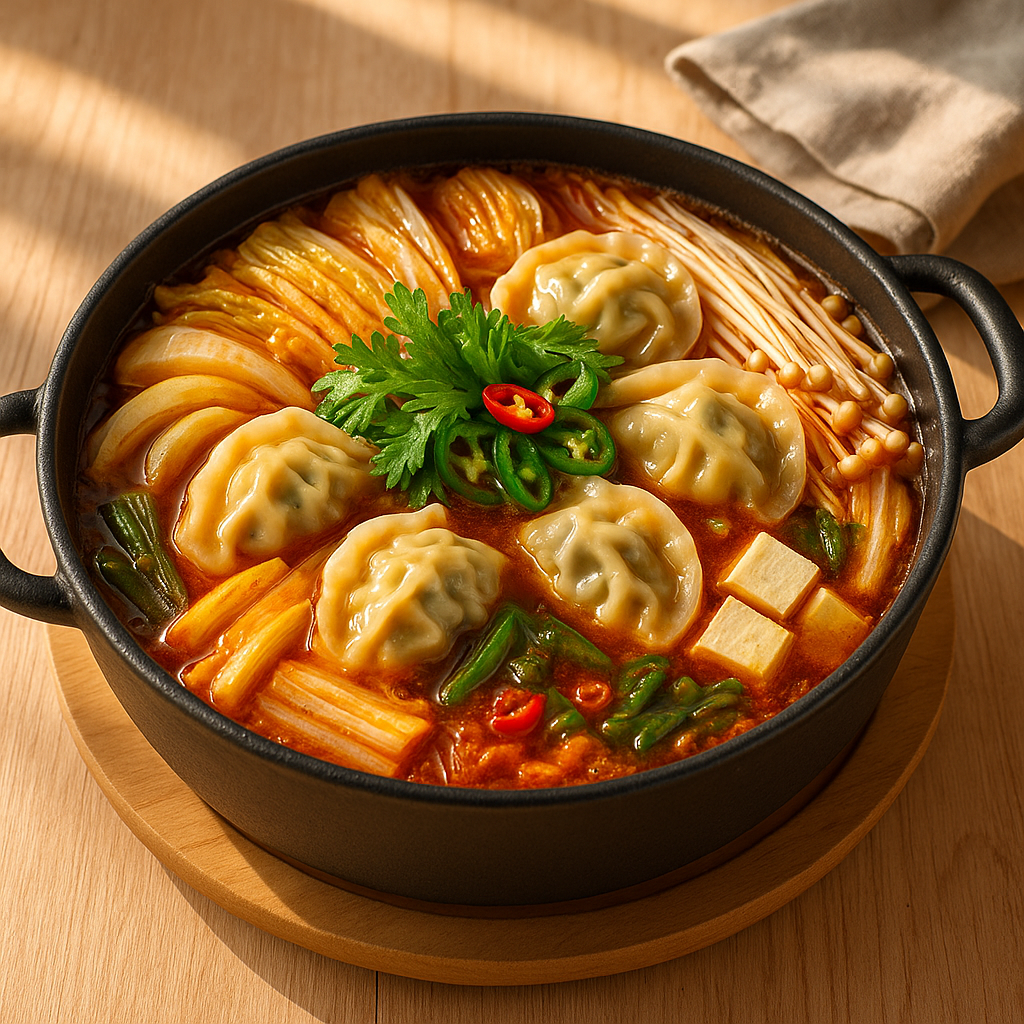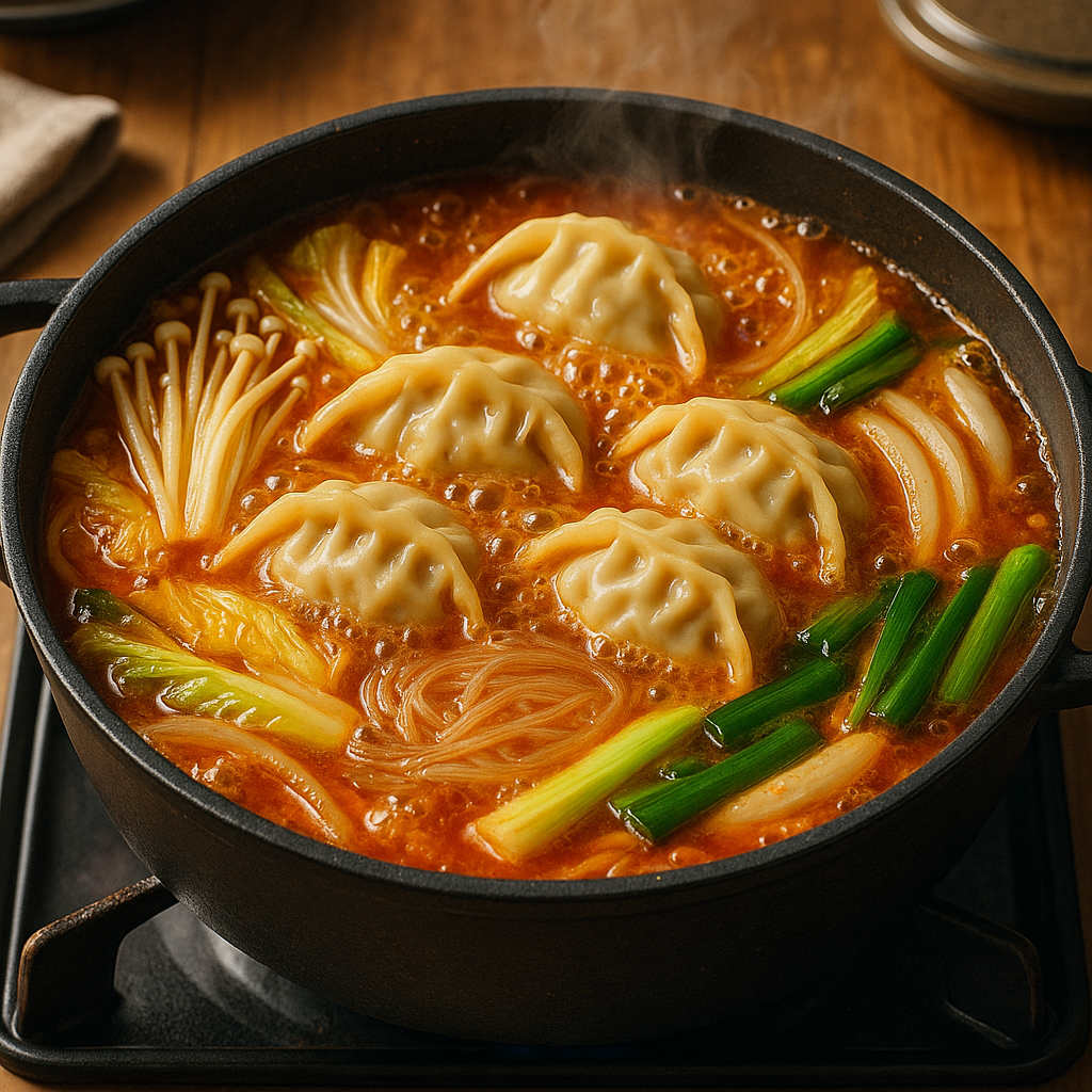 안녕하세요! 오늘은 집에서도 간단하게 즐길 수 있는 얼큰한 만두전골 레시피를 소개할게요.